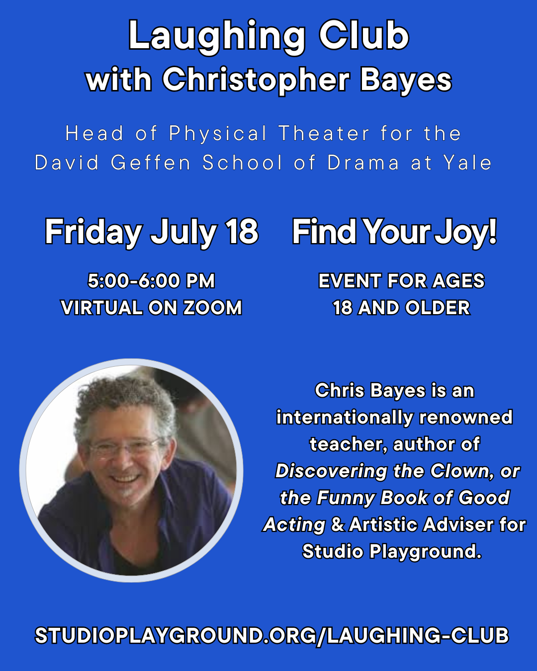 Laughing Club is a wellness practice created by Christopher Bayes, internationally renowned teacher and Head of Physical Acting for the David Geffen School of Drama at Yale. The workshop is for actors, performers, and anyone with a desire to explore the health benefits of laughter. Christopher Bayes is Professor in the Practice of Acting and Head of Physical Acting at David Geffen School of Drama, Director of the Pandemonium Studio, and Artistic Advisor for Studio Playground. Laughing Club was featured on NY1/New Yorker of the Week.